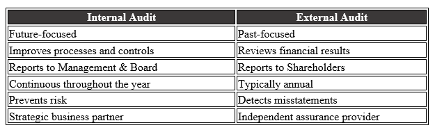 While External Audit verifies financial statements annually, Internal Audit strengthens the systems that generate financial data.